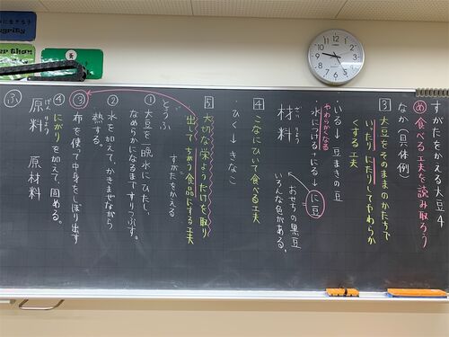すがたをかえる大豆の4時間目の授業です。 なかの部分を読み取りました。 授業を通して語彙を増やす なかの部分には、大豆がすがたをかえる具体例が書かれています。最初の授業で、子供たちが見つけた5つの工夫です。この工夫について、細かく読んでいきまし…